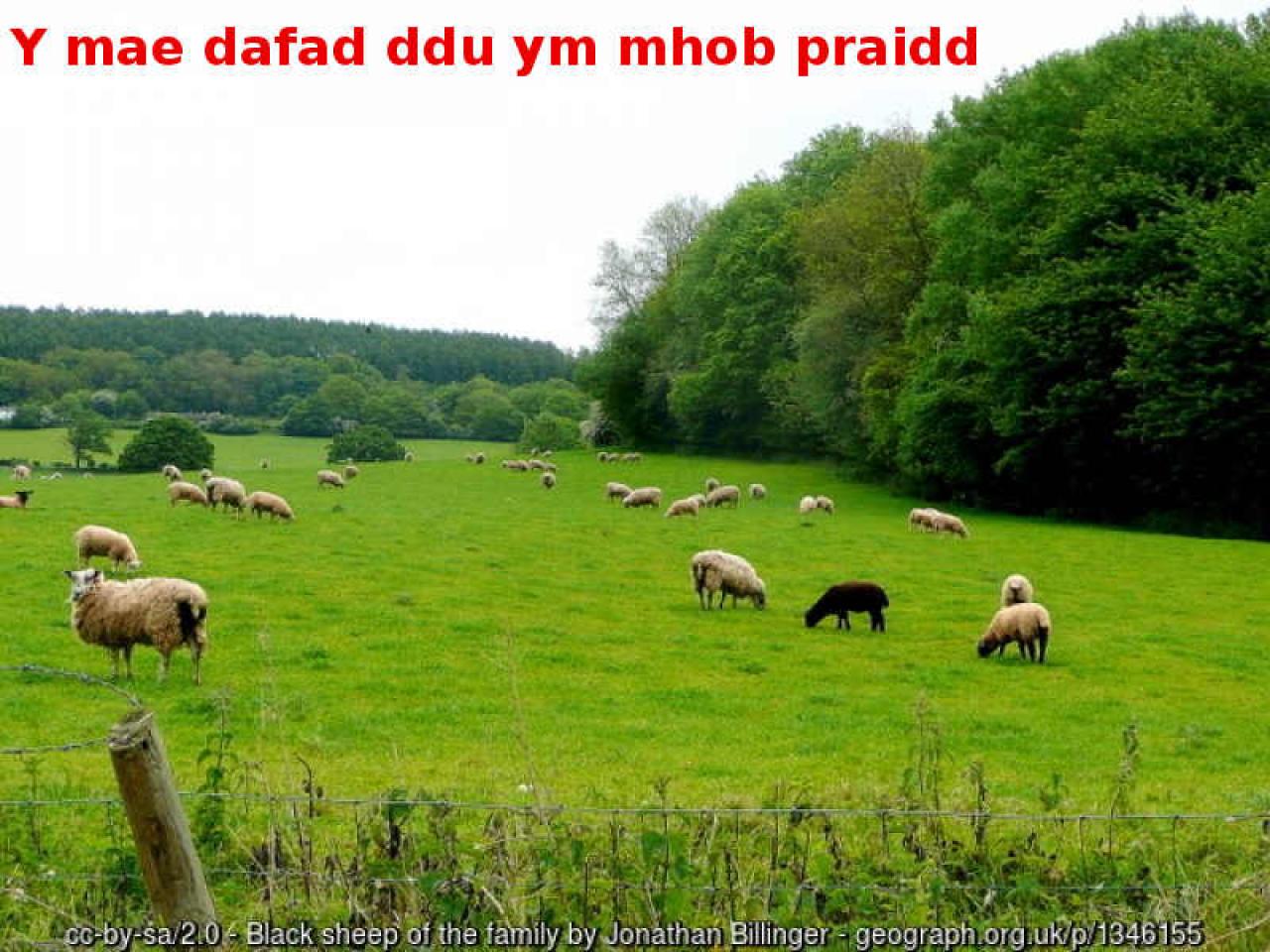 In the sample sentence above on this page you will observe that the spelling of two words ( ddu , mhob ) differ from the spelling on the relevant Geiriadur listing page ( Du - Black , Pob - All, Each, Every ). Be not alarmed!