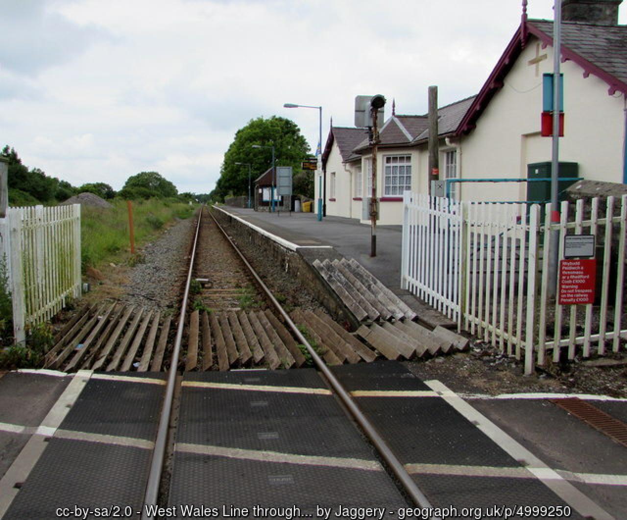 Dyma lle dyn ni'n aros nes bod y trenau wedi mynd heibio.