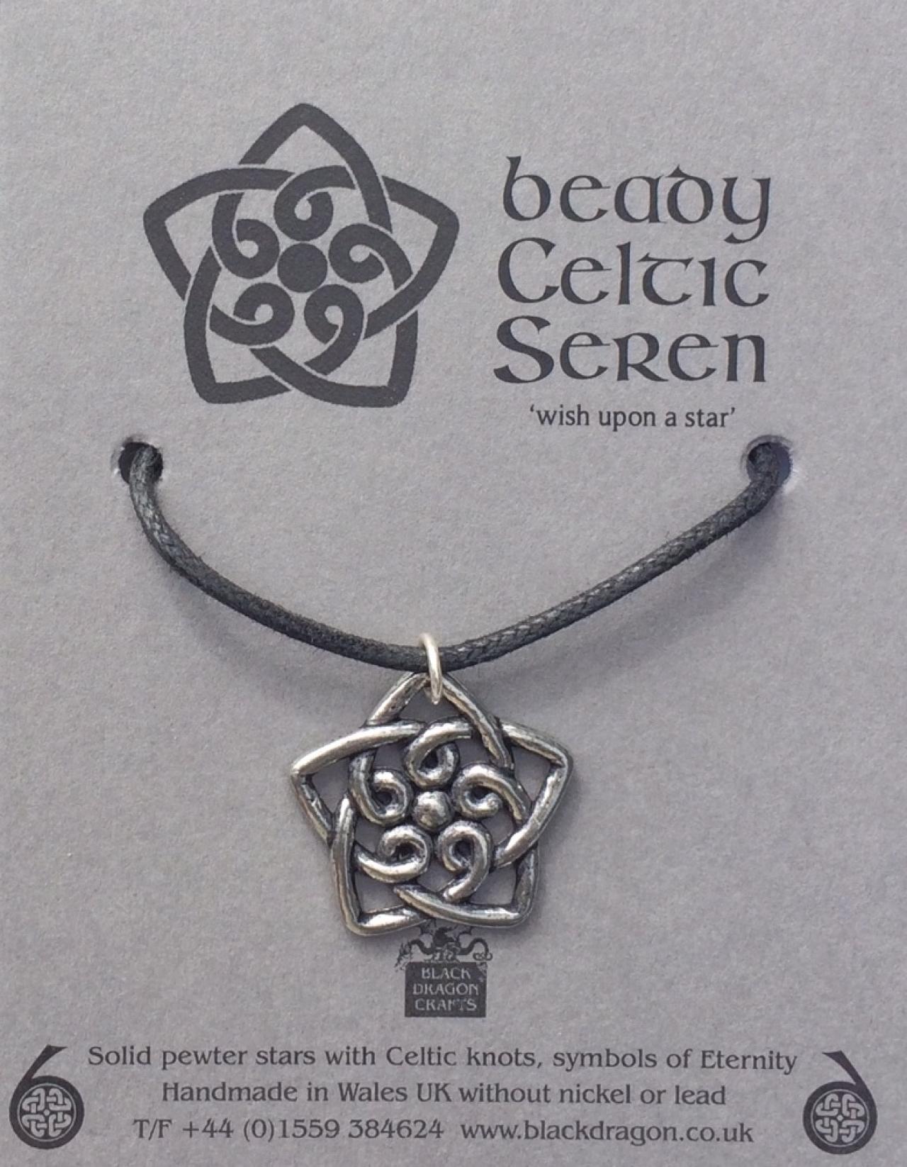 Plain and simple: a Celtic knot inside a pewter Seren Star on a 16" waxed cotton cord, with fastener. On a card!
