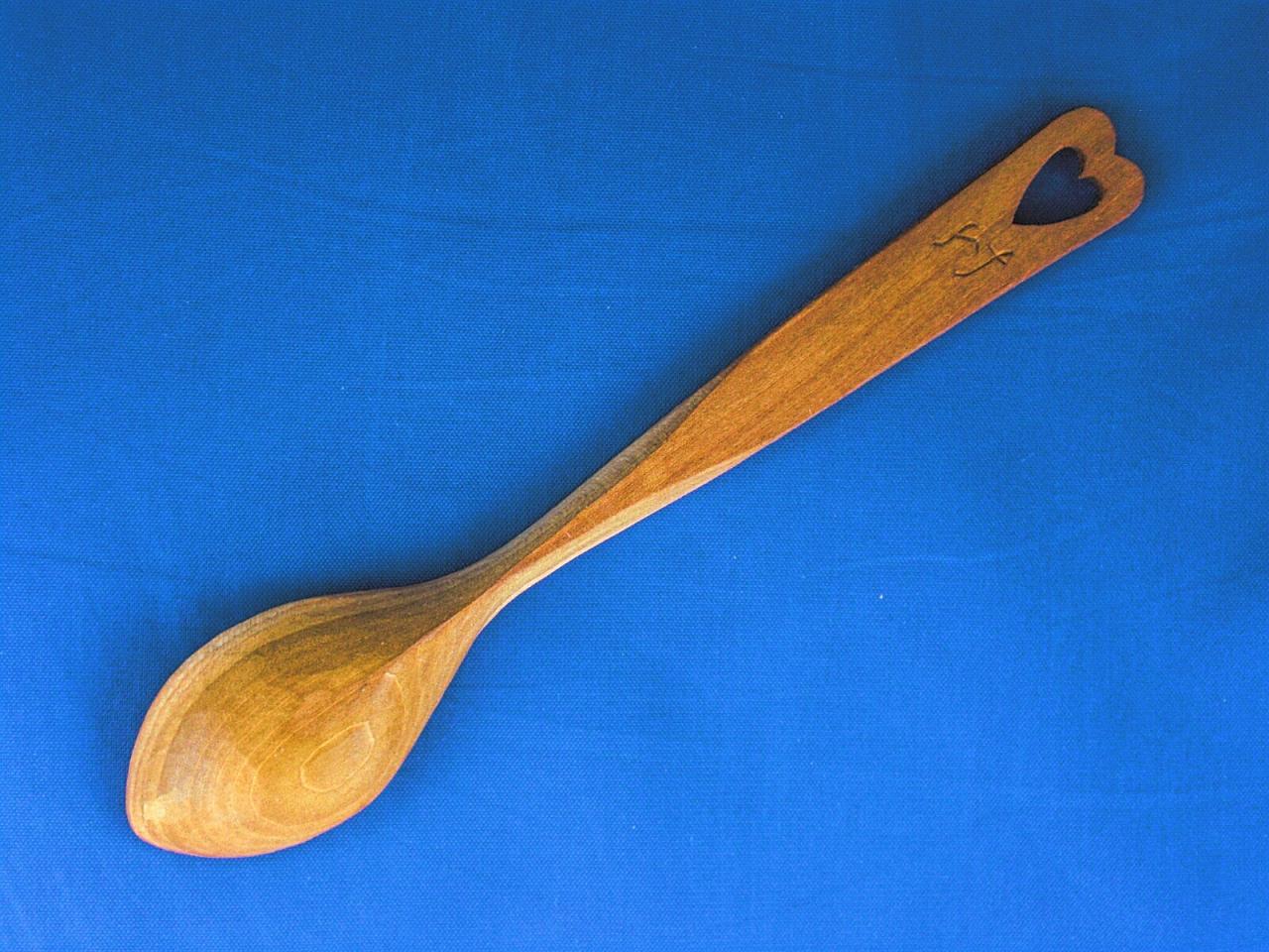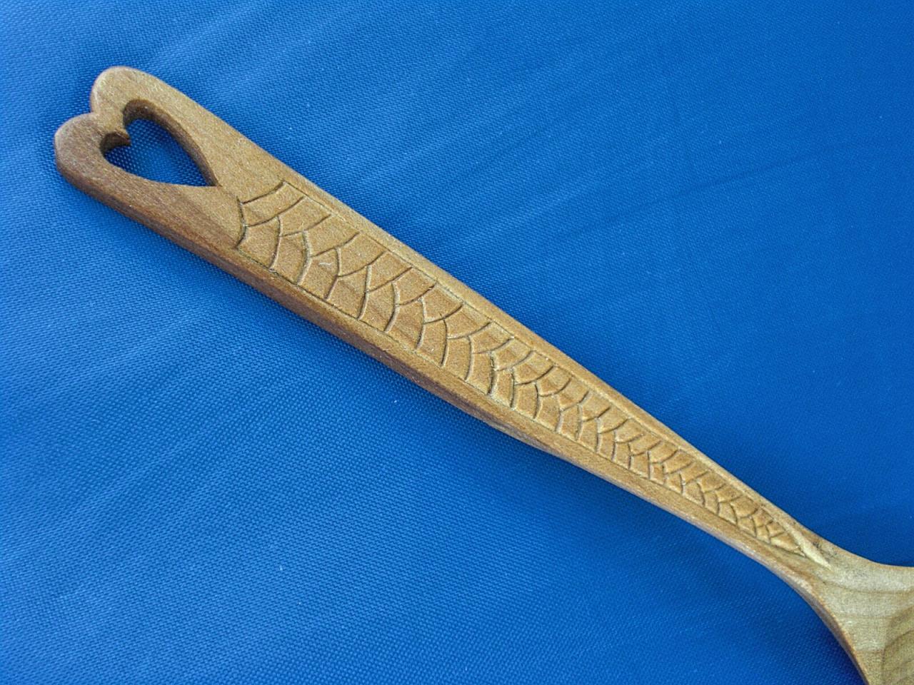 This is a simple lovespoon very much in the tradition of the earliest Welsh examples. Their simplicity of design, however, did not detract from the hopes and dreams of the rural Welsh swains that carved them. This spoon is 8" long, carved from poplar and finished with food-grade walnut oil for a durable finish. This spoon can be used on a daily basis for anything from stirring your tea to eating ice cream. With such use it will develop a lovely patina that will only enhance its beauty.