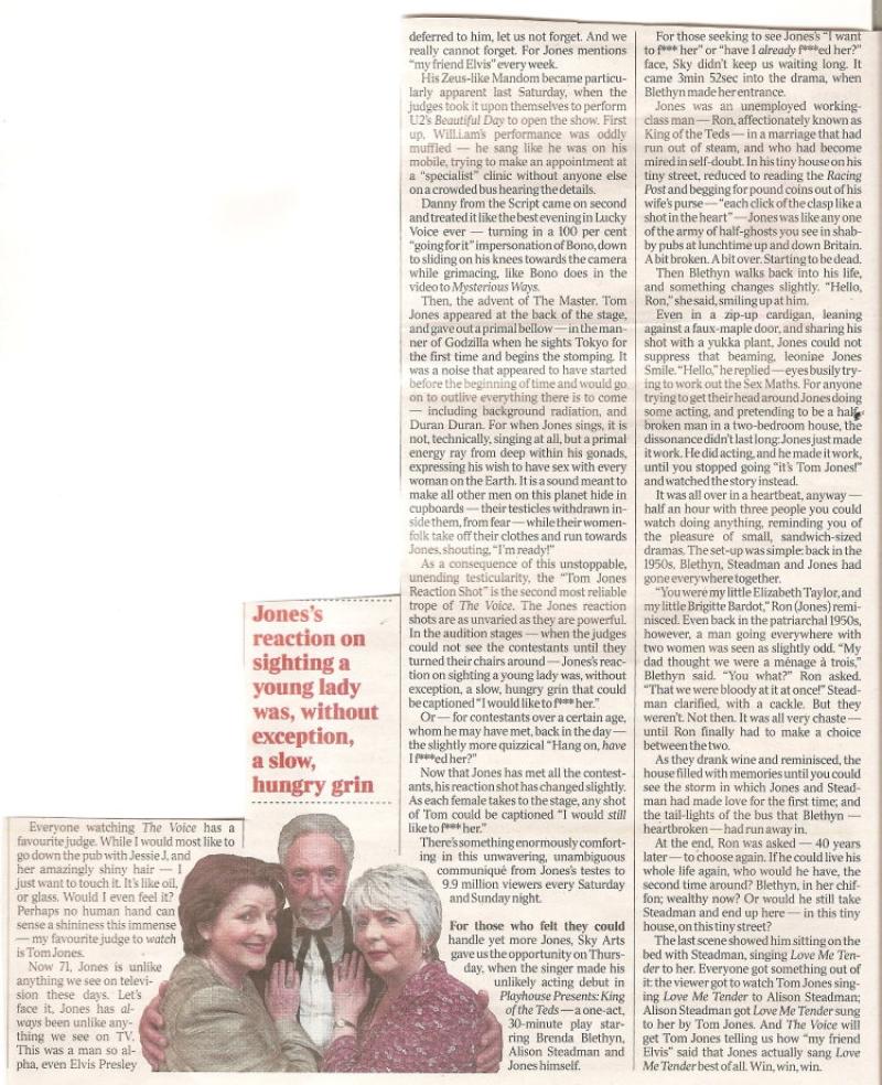 Caitlin Moran's TV column, The Times. "Tom Jones singing? It's an energy ray from deep within his gonads".